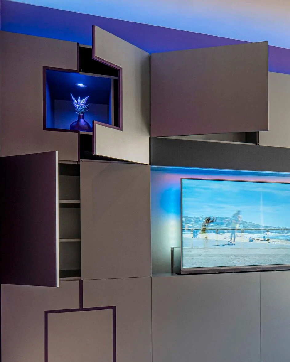 A shimmer finish scintillates as light refracts off the silver cabinetry surfaces giving them a metallic appearance, while strong angular lines are finished with vibrant purple inlays to create a feature out of asymmetric concealed storage.