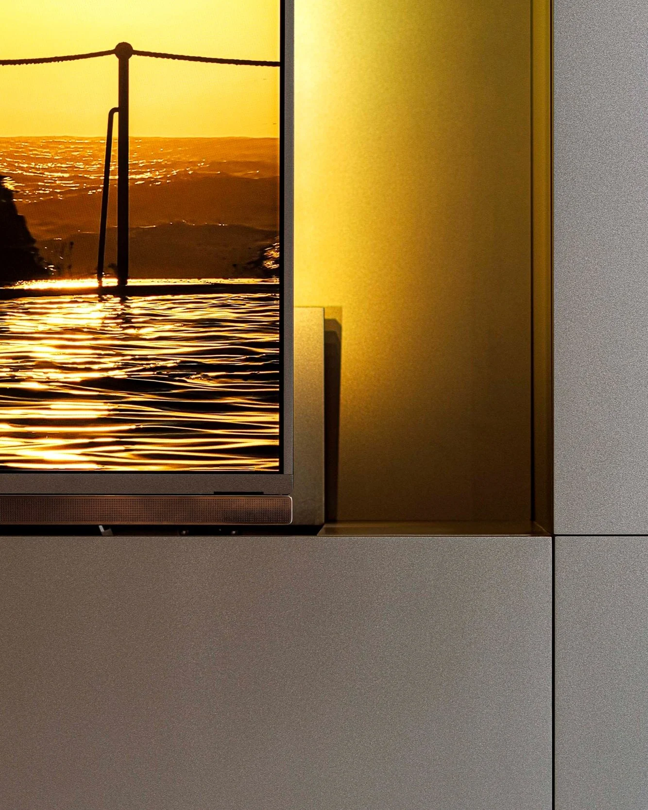 An automated display with a hinged lid allows the client to enjoy music without visual distractions by concealing the display from view when it isn’t in use.