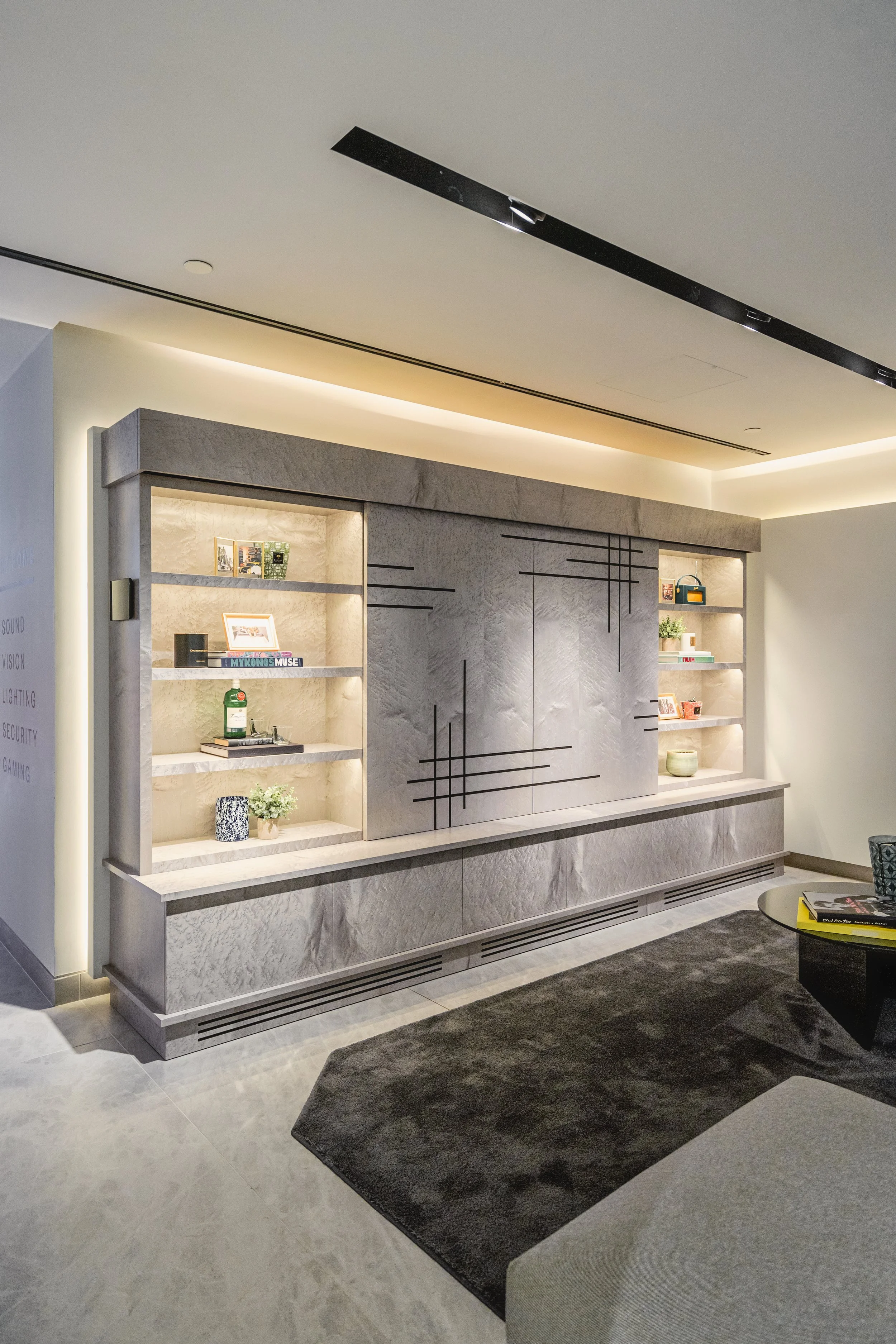 The centrepiece of this media wall are the automated sliding panels, which can conceal your display from view when it isn’t in use.