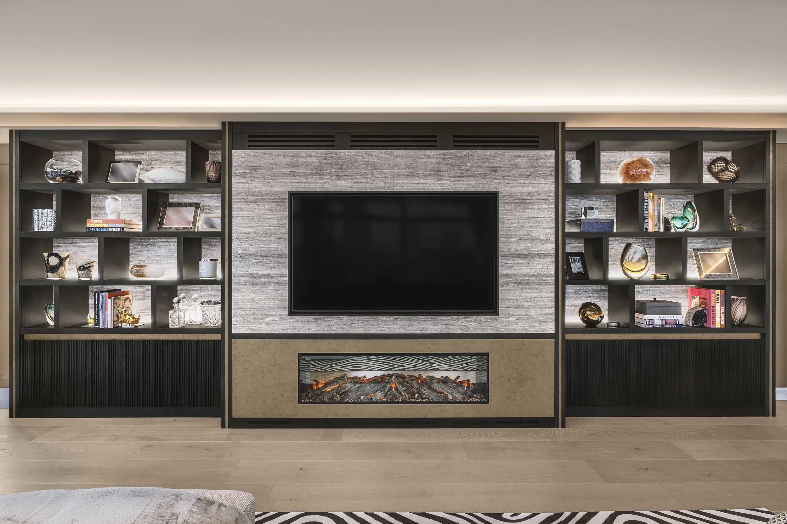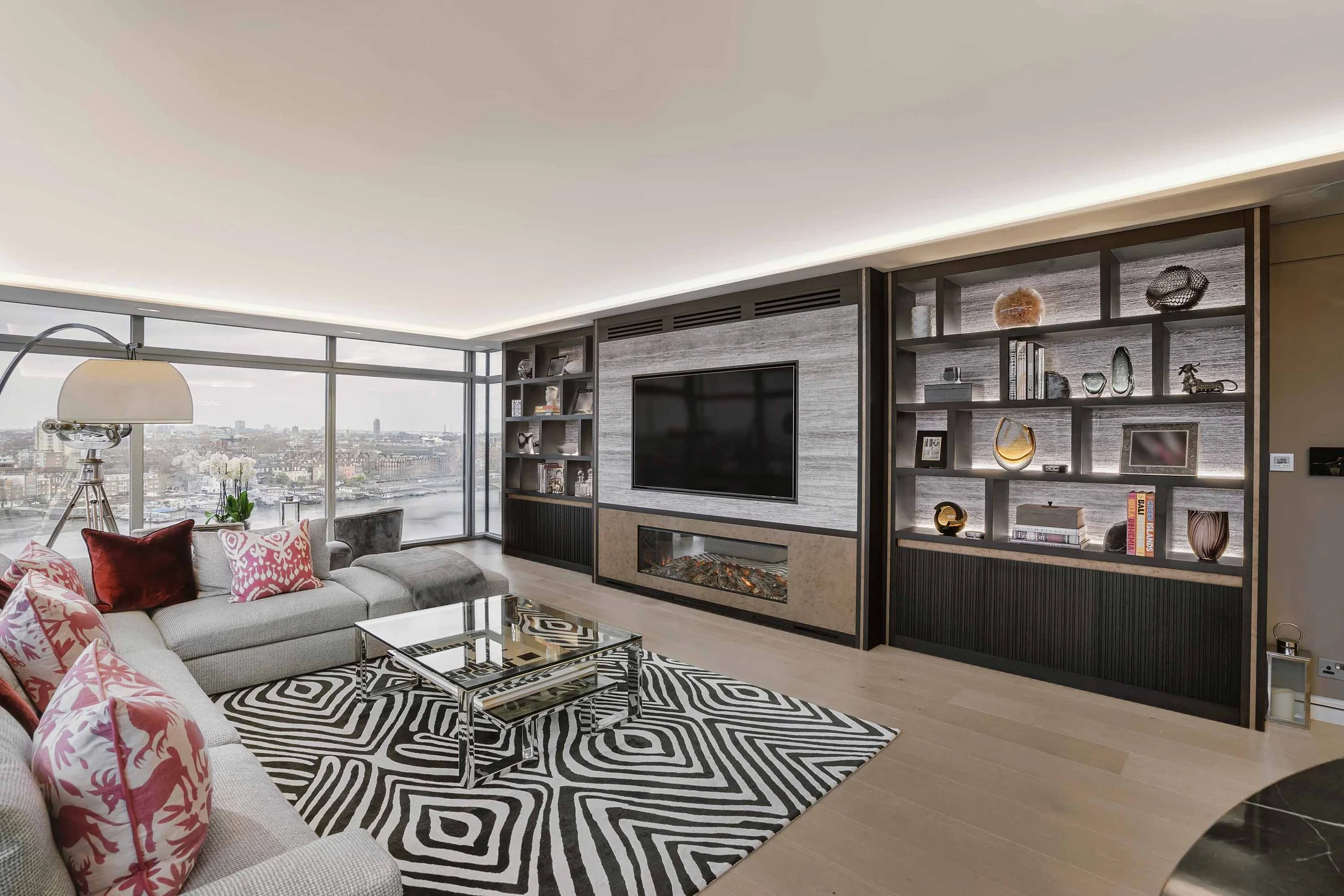 Our team crafted a bespoke media wall and accompanying bar for a luxury multi-dwelling unit situated along the Thames River in London, UK. The penthouse boasts breathtaking panoramic views of one of the world’s most iconic skylines.