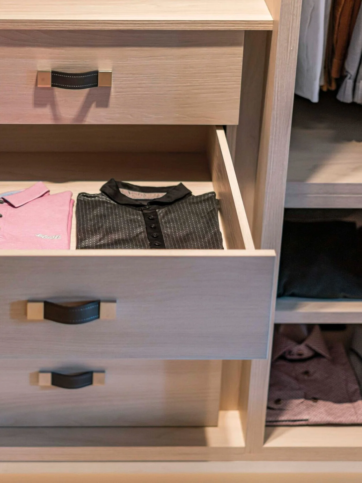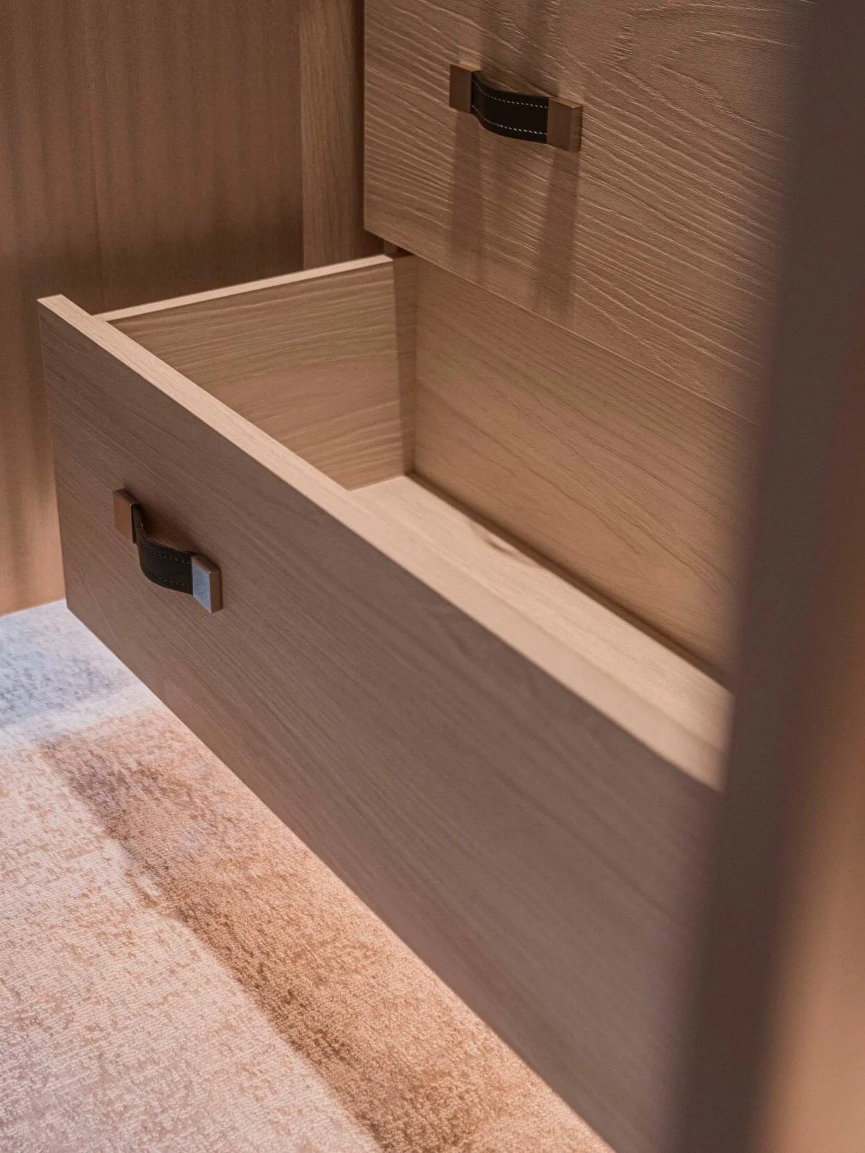 Soft-close drawers are accented with leather and steel handles to complement the colouring of the exterior wood pillars and bring additional character to the interior of the cabinetry.
