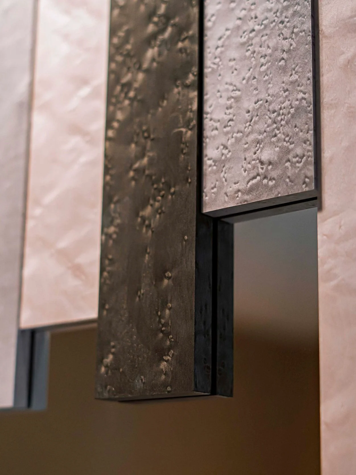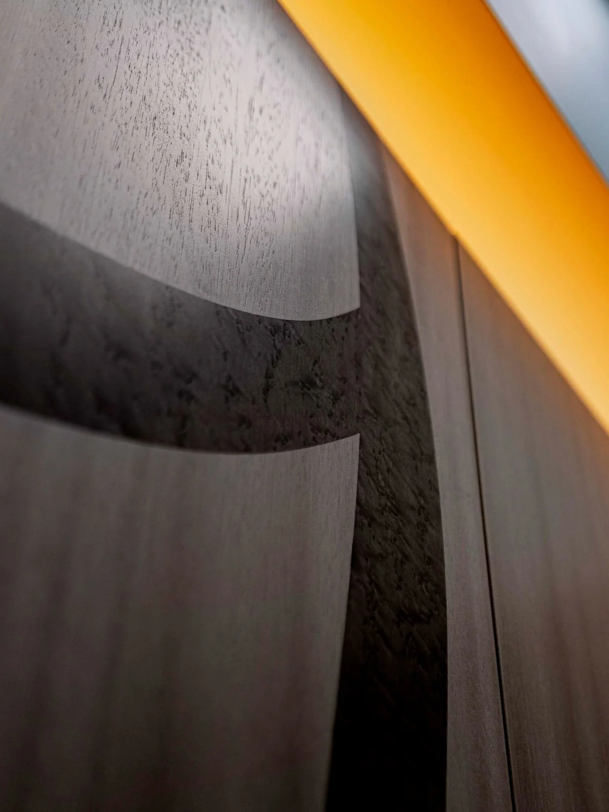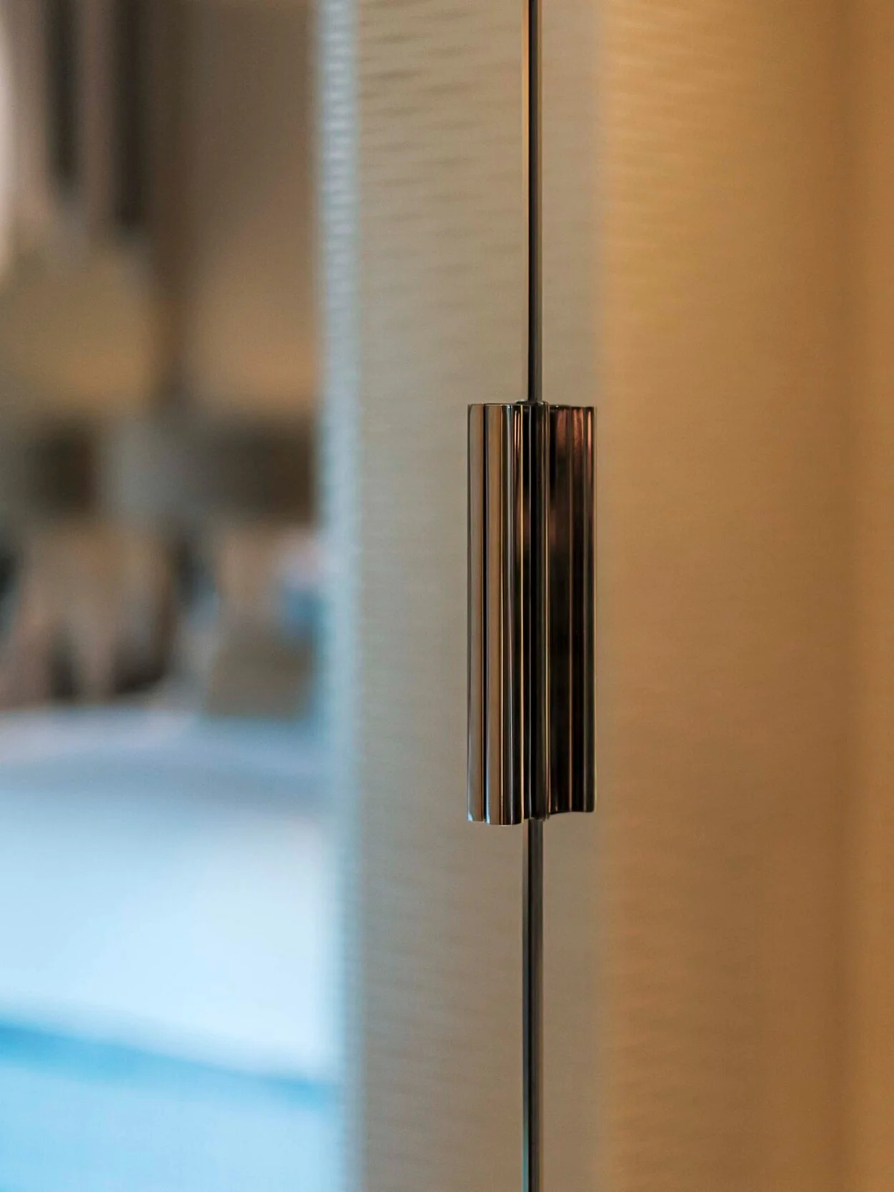 Vertical textured pillars are layered to catch the light as the doors are opened and closed. A smooth sliding mechanism reveals personalised cabinetry catering to the client’s specific requirements.